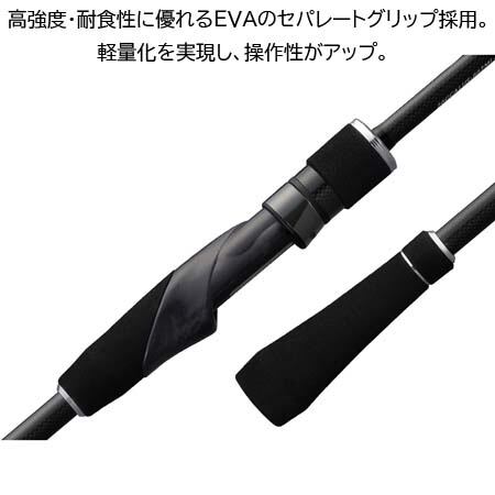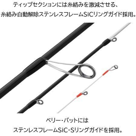 ティップセクションには糸絡みを激減させる、糸絡み自動解除ステンレスフレームSiCリングガイド。ベリー・バットにはステンレスフレームSiC-Sリングガイド。ジョイント部は逆並継でまるでワンピースのような優美なベンディングカーブを描く。オリムピック独自開発のオリジナルカーボンリールシートOP-02をダウンロック方式で採用。高感度・軽量化を実現し繊細なエギの操作を可能に。高強度・耐食性に優れるEVAのセパレートグリップ採用。