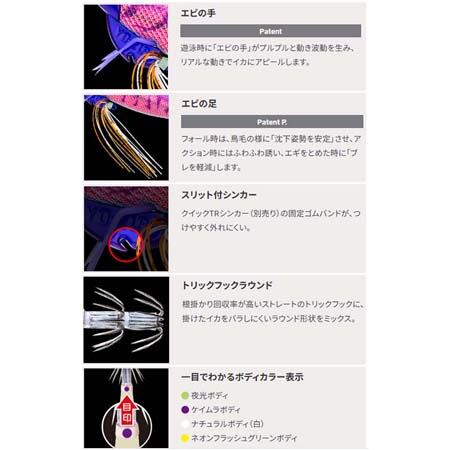 ●エビの足…フォール時は鳥毛の様に沈下姿勢を安定させ、アクション時にはふわふわ誘い、エギをとめた時にブレを軽減。