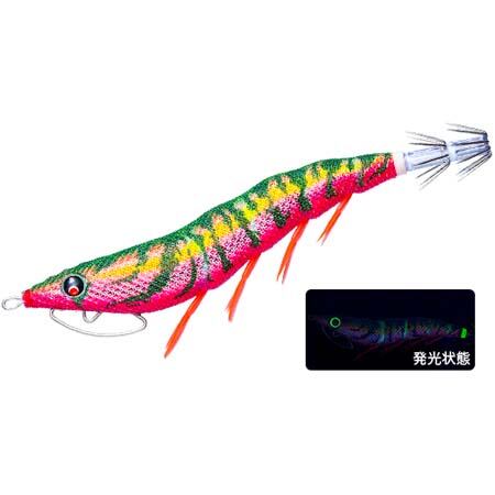夜光ボディ。シルエットがしっかり出る赤ベースにナチュラルなグリーンの組み合わせ。夜光の光で深場に潜む低活性のイカも反応させる。