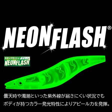 ネオンフラッシュグリーン。紫外線発色ボディ。紫外線が届きにくい濁り潮の状況でもボディ本体のチャート系カラーがアピール効果を増加させイカをしっかり寄せる