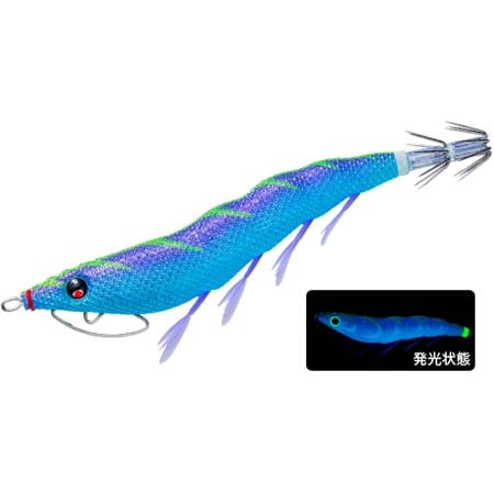 ブルー夜光ボディ。ブルー系をベースにパープルバックを搭載。海に馴染むカラーリングはスレイカに効果を示す一方で、伝統的なグリーンの杉模様とのコントラストはエギの存在をイカに知らせる。