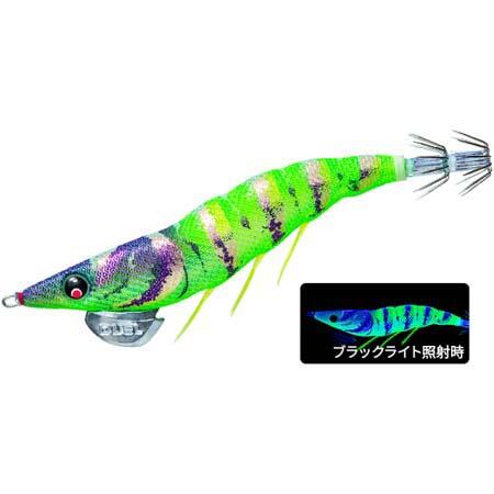 紫外線発色ボディ。ネオンフラッシュグリーン。紫外線が届きにくい濁り潮の状況でも、ボディ本体のチャート系カラーがアピール効果を増加させイカをしっかり寄せる。