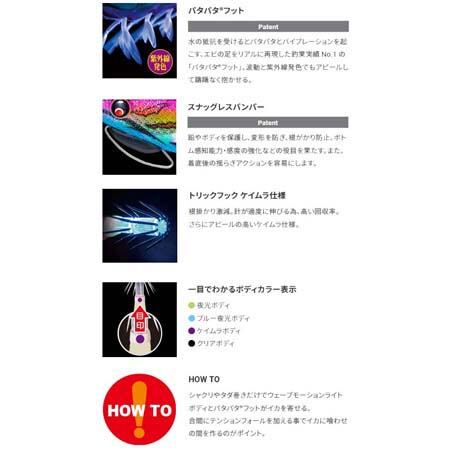 ■パタパタフット…水の抵抗を受けるとパタパタとバイブレーションを起こす、エビの足をリアルに再現。波動と紫外線発色でもアピール