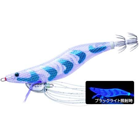 紫外線発色。無彩色の布とケイムラボディ、部分的なブルーの下地を組み合わせ。ケイムラ発光とブルー下地の控えめな反射光はベイト感を演出しアピール&ナチュラルを両立。透明感も備わっているため昼間から月夜・常夜灯まわりなど少しでも光量があるロケーションで強みを発揮してくれる汎用性も魅力