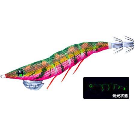 夜光ボディ。シルエットがしっかり出る赤ベースにナチュラルなグリーンの組み合わせ。夜光の光で深場に潜む低活性のイカも反応させる。