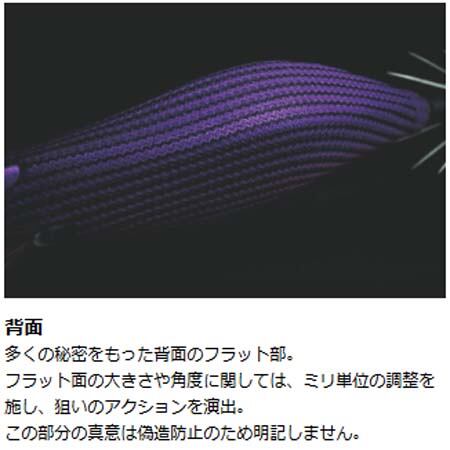 ■フック:オーナーばり社製フック使用。ストレートフックを使用することでタイムロスのない瞬間的なフッキングを実現。大きいから掛かりが良いなどの浅い考えではなく、ボディからの水流をフックに流すことによる直進安定性を追求。イカを掛けるためだけのフックではありません