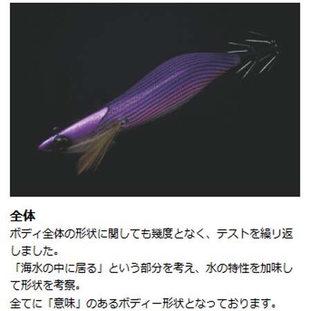 ■フック:オーナーばり社製フック使用。ストレートフックを使用することでタイムロスのない瞬間的なフッキングを実現。大きいから掛かりが良いなどの浅い考えではなく、ボディからの水流をフックに流すことによる直進安定性を追求。イカを掛けるためだけのフックではありません