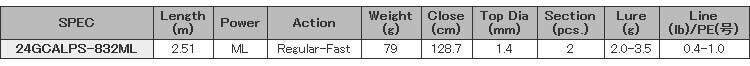 【Length(m)】2.51【Power】ML【Action】Regular-Fast【Weight(g)】79【Close(cm)】128.7【Top Dia(mm)】1.4【Section(pcs.)】2【Egi(号)】2.0-3.5【LinePE(号)】0.4-1.0※ご注文確定後の返品・交換不可のためご注意ください。※発送目安:ご注文確定より最大で4営業日ほどかかる場合がございます。