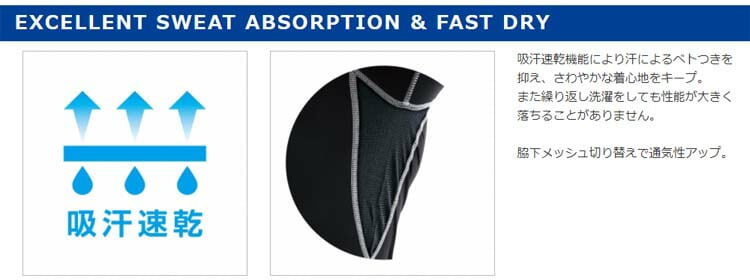 高い接触冷感機能を誇る異形断面繊維を使用、縫い糸が気になる臭いをスピード消臭、優れた吸汗速乾機能で汗を逃し、さらりと快適な着用感をキープするコンプレッションウエア。