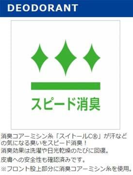 ・消臭コアーミシン糸「スイトールC」が汗などの気になる臭いをスピード消臭!消臭効果は洗濯や日光乾燥のたびに回復。